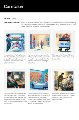 We used Chat GPT to quickly develop story board images for user scenarios extracted from our interview and survey content. This process helped uncover and personify the unique painpoints our users were facing. We used these to inform our sitemap and other design decisions.