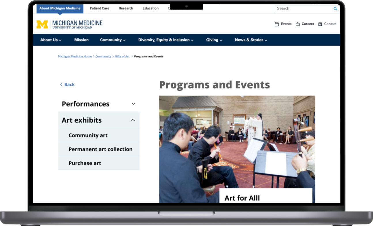 The restructured site architecture and enhanced navigation make Gifts of Art easier to locate within the broader Michigan Medicine ecosystem. The newly defined user flows guide each user group through key tasks with clear starting and ending points. These changes reduce confusion, improve task completion rates, and foster more positive interactions with the program.