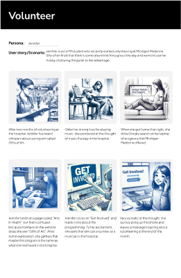 Jennifer is a nursing student volunteering at Michigan Medicine. She wants to learn how to get involved and needs information about the organization that’s fast and trustworthy. She values clarity and confirmation that her interest is being seen and acknowledged.